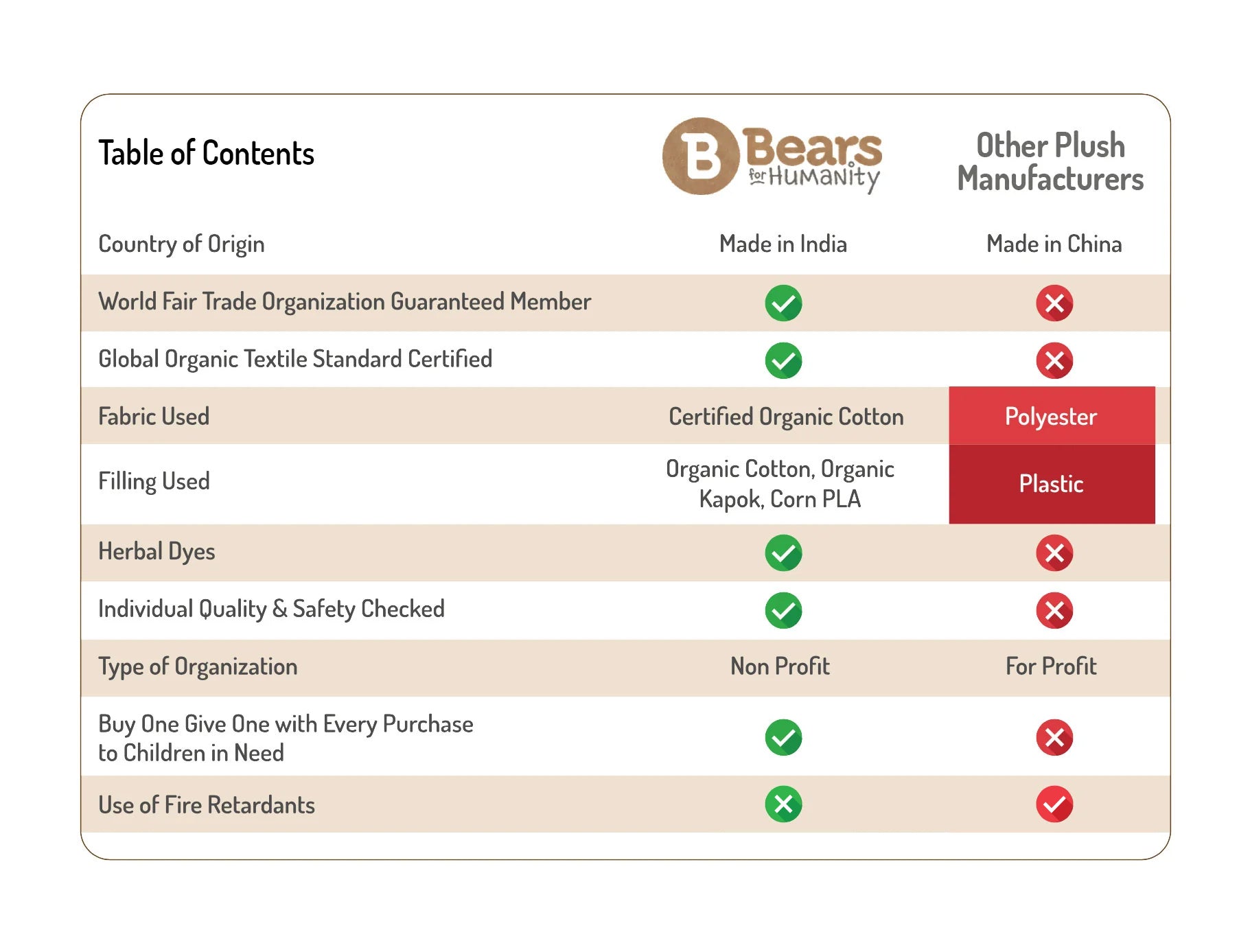 Bears for Humanity makes organic, fair-trade plush toys in India, using certified cotton and natural fillings, unlike competitors who use polyester and plastic. As a nonprofit, it follows a "Buy One, Give One" model, uses herbal dyes, avoids fire retardants, and faces no tariffs, unlike for-profit manufacturers in China.